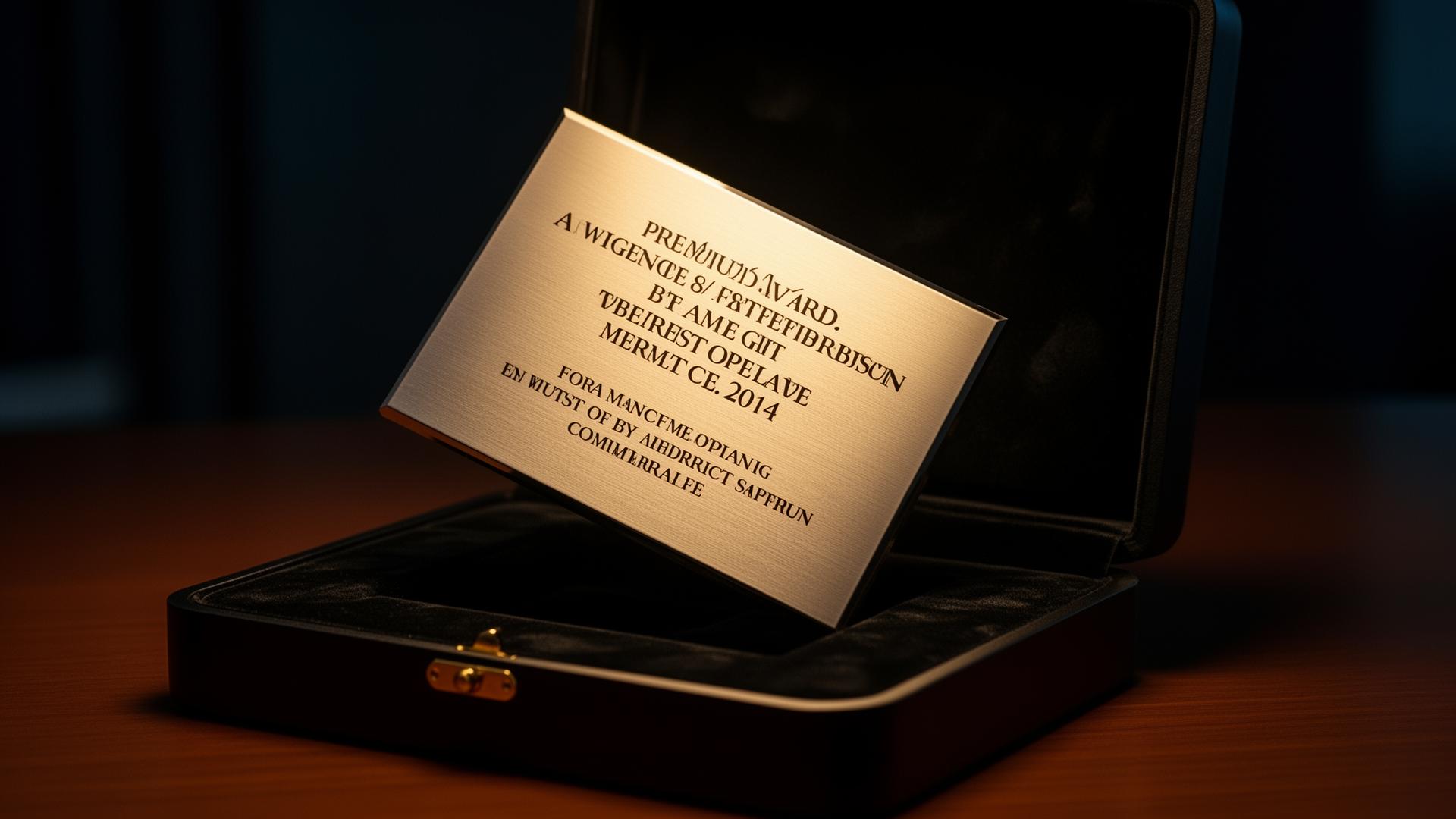 Placa de homenagem em aço escovado com estojo em veludo. Porque quem se dedicou o ano todo merece mais do que um troféu de plástico.